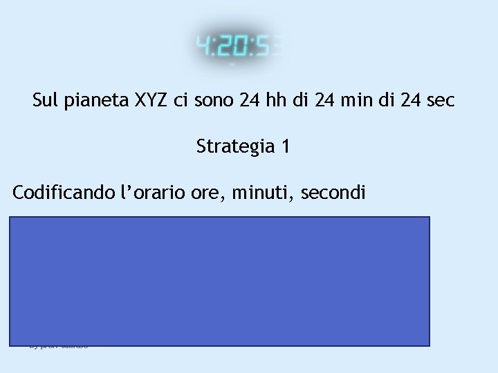 Sul pianeta XYZ ci sono 24 hh di 24 min di 24 sec Strategia 1 Codificando l’orario ore, minuti, secondi 24 ore: servono 5 bit 25 = 32>=24 24 minuti: servono 5 bit 25 = 32>=24 24 secondi: servono 5 bit 25 = 32>=24 In tutto: 5+5+5 = 15 bit By prof. Camuso