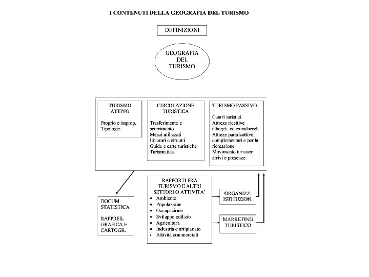 Turismo passivo o ricettivo • • • Luoghi del turismo (stazioni-località-nuclei-centri) Tipologie dei centri turistici Attrezzature turistiche Movimento turistico Regioni turistiche
