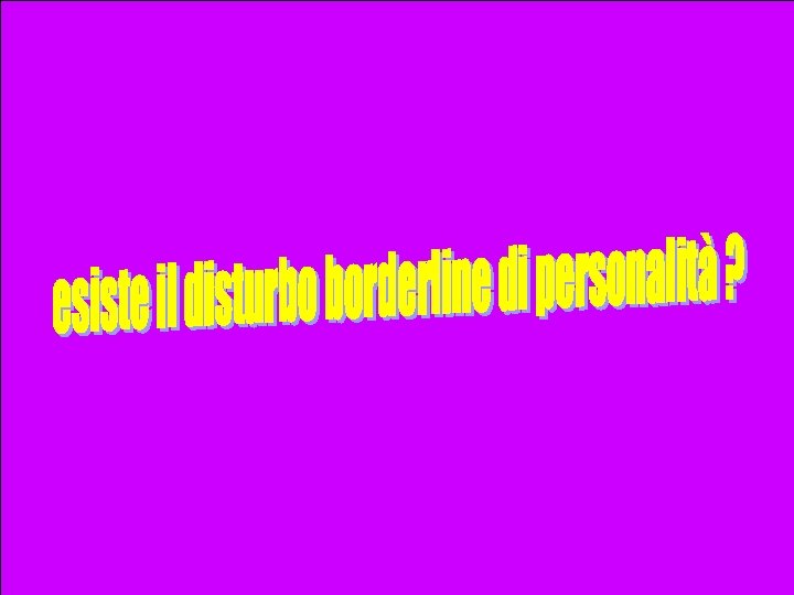 DISTURBO BORDERLINE Criteri del DSM IV 4) impulsività in almeno 2 aree che sono potenzialmente dannose per il soggetto, quali spendere, sesso, uso di sostanze, guida spericolata, abbuffate (esclusi i comportamenti automutilanti considerati in 5) 5) ricorrenti minacce, gesti o comportamenti suicidari, o comportamento automutilante 6) instabilità affettiva causata da una marcata reattività dell’umore (ad esempio intensa disforia episodica, irritabilità o ansia che dura di solito poche ore e soltanto di rado supera pochi giorni) 7) sentimenti cronici di vuoto 8) rabbia immotivata e intensa o mancanza di controllo della rabbia 9) gravi sintomi dissociativi o transitoria ideazione paranoide correlata a eventi stressanti