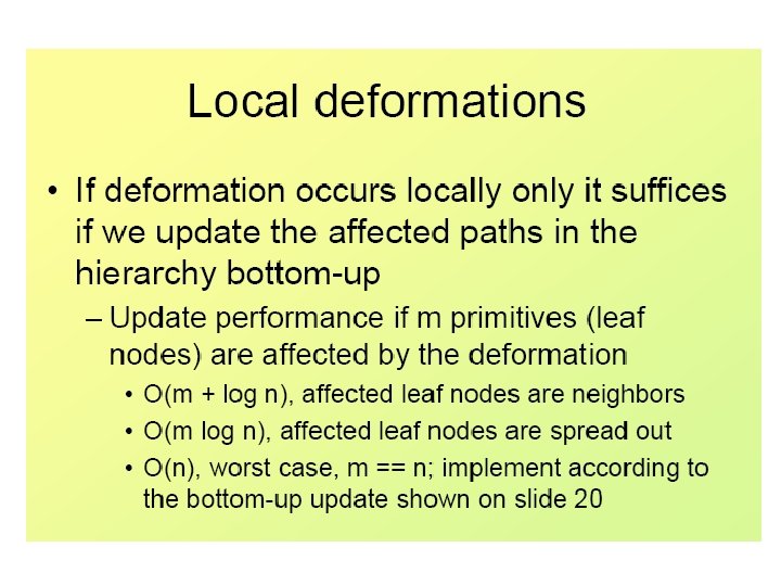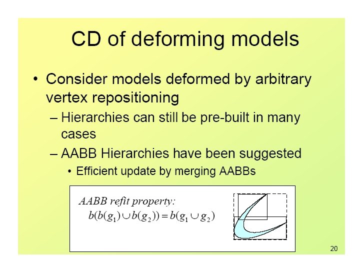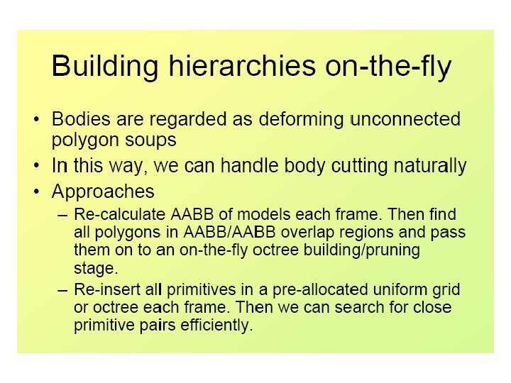 Deformable Collision Detection • Consider spatial subdivision and hierarchical methods for now • Others. . . graphics hardware • Similar to nondeformable case • fast query times, e. g. , O(lg. N) for hierarchies • But must update structure after deformation • various trade-offs • typically involves O(N) work for N simplices • Methods can be specialized for cloth-like and strand-like objects (more on that later)