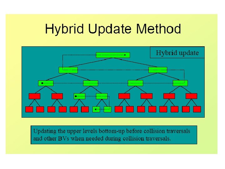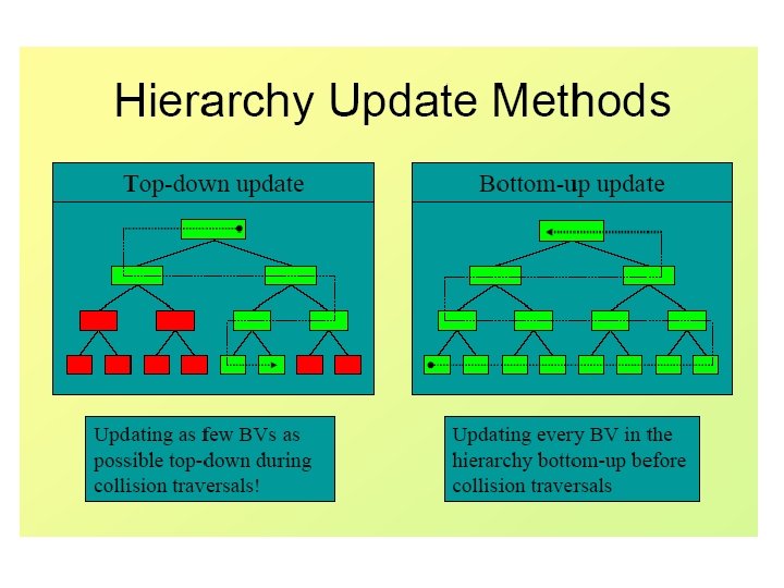 Bounding Volume Hierarchies • Model Hierarchy: – each node has a simple volume that bounds a set of triangles – children contain volumes that each bound a different portion of the parent’s triangles – The leaves of the hierarchy usually contain individual triangles • A binary bounding volume hierarchy:
