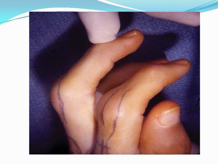 1. Intrinsic Plus Deformity �The intrinsic plus deformity is caused by tightness and contracture of the intrinsic muscles. � In hands with intrinsic plus deformity, the proximal interphalangeal joint cannot be flexed while the metacarpophalangeal joint is fully extended. � Often, the deformity develops in combination with volar subluxation of the metacarpophalangeal joints and ulnar deviation of the fingers