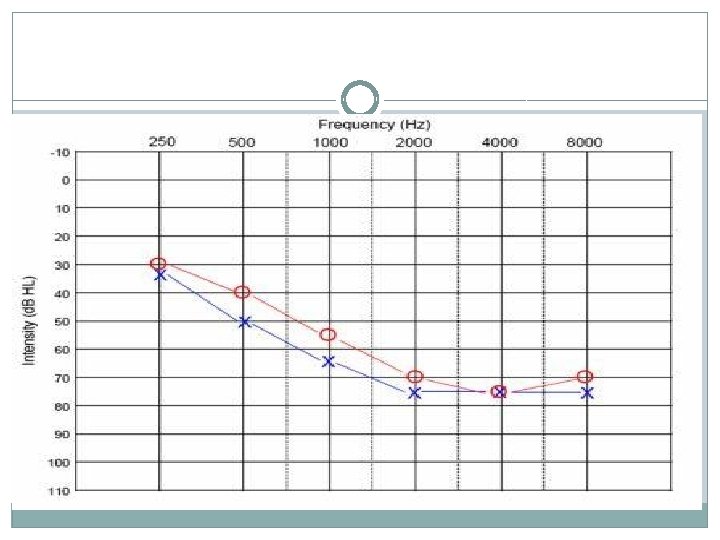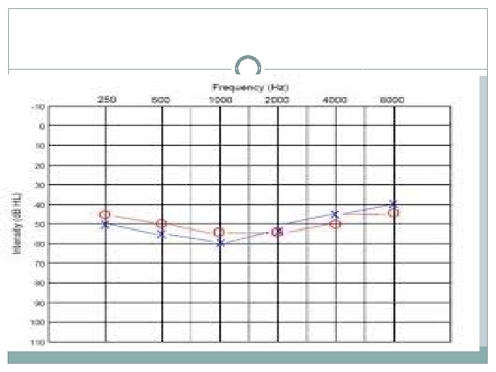 Determining the Hearing Loss § Normal HL : -10 to 20 d. B § Mild HL : -20 to 40 d. B § Moderate HL : -41 to 55 d. B § Moderately Severe HL : -56 to 70 d. B § Severe HL : -71 to 90 d. B § Profound HL : -91 d. B and above