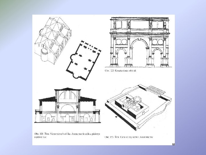 Architektura • zpočátku ovlivněná Etrusky (oblouk, klenba) a Řeky (sloup, štít) v období císařství se propracovala k svému projevu, vrcholem vývoje křesťanské období • používá se různých druhů kamene, mramor i pálené cihly, objev betonu • stavby církevní - chrámy světské - veřejné budovy- baziliky, termy, amfiteátry, divadla, císařské paláce, venkovské vily, vítězné oblouky a sloupy, mauzolea, užitkové stavby- silnice, akvadukty, viadukty