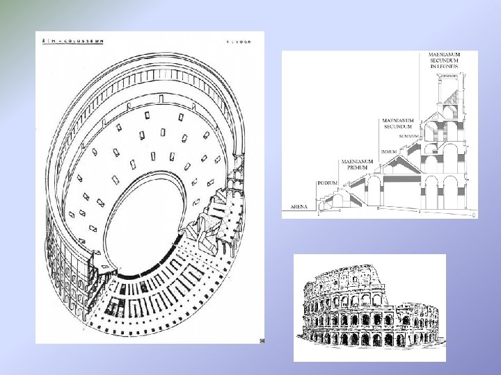 Amfiteátry Arlés, Francie Pula, Chorvatsko mají okolo elipsové arény hlediště se stoupajícími řadami sedadel a s klenutými ochozy největší je Vespasiánův amfiteátr = Koloseum další v Pompejích, Veroně, Arles, Nimes apod. Pompeje, Itálie