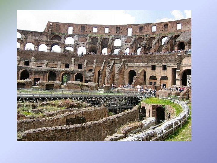 Koloseum - Amfiteatr Flavium Největší amfiteátr je v centru Říma, nachází se východně od Fóra Romana, jeho stavba začala kolem r. 70 n. l. za římského císaře Vespasiana a byla dokončena v r. 80 n. l. za Tita. Za vlády Domitiana (81– 96) byly provedeny některé další úpravy, jméno je odvozeno od rodového jména Flavius; původně byl schopen pojmout 50 000 sedících diváků a byl užíván ke gladiátorským zápasům a veřejným podívaným, pořádaly se zde i naumachie (stylizované námořní bitvy), zápasy s divou zvěří, popravy, rekonstrukce známých bitev a dramata založená na klasické mytologii; 3 poschodí nad sebou s oblouky, využívá dórské, ionské i korintské sloupy