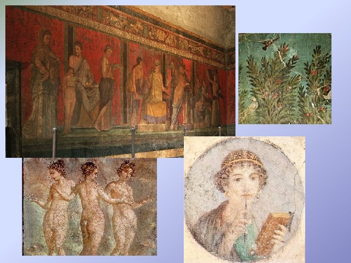 Malířství • portréty, krajiny, žánrová malba a zátiší • fresky, mozaiky, tabulová malba (nálezy z Pompejí, Herkulanea a Stabie - zničené r. 79 výbuchem Vesuvu, objevil před r. 1600 Domenico Fontano) • nápodoba obložení mramorem, zdání skutečné architektury, ornamenty • portréty na deskách ve víku rakve vystihující podobu zemřelého, malované temperou • Náměty fresek byly většinou zahrady a idylické krajiny, které měly jako malovaná architektura spoluvytvářet iluzi prostoru a zjemňovat místnost. Malíř si ke svému dílu pečlivě připravil stěny místností, i technika míchání barvy byla nesmírně složitá. Provedení fresek bylo precizní, se snahou o co nejreálnější znázornění. Malby byly často kopiemi řeckých obrazů nebo jimi byly úzce inspirovány, stejně jako řecké fresky však postrádaly využití principu světla a stínu.