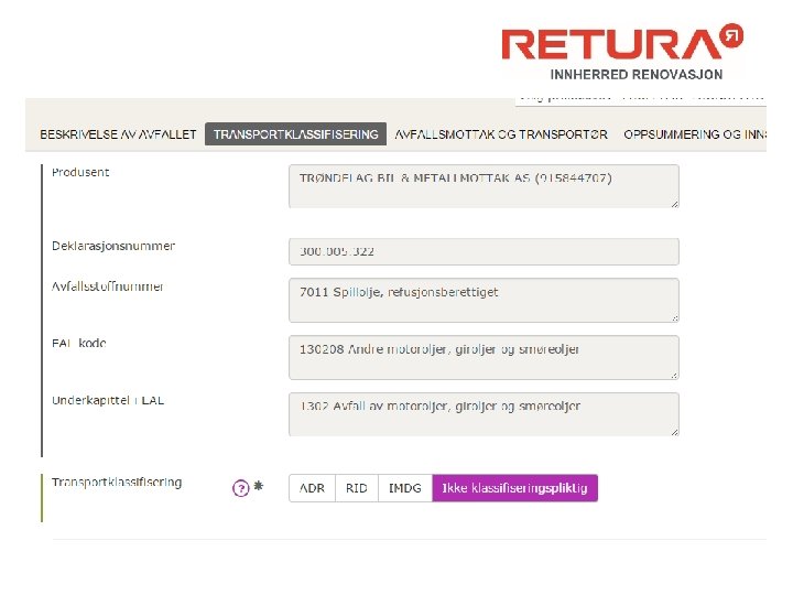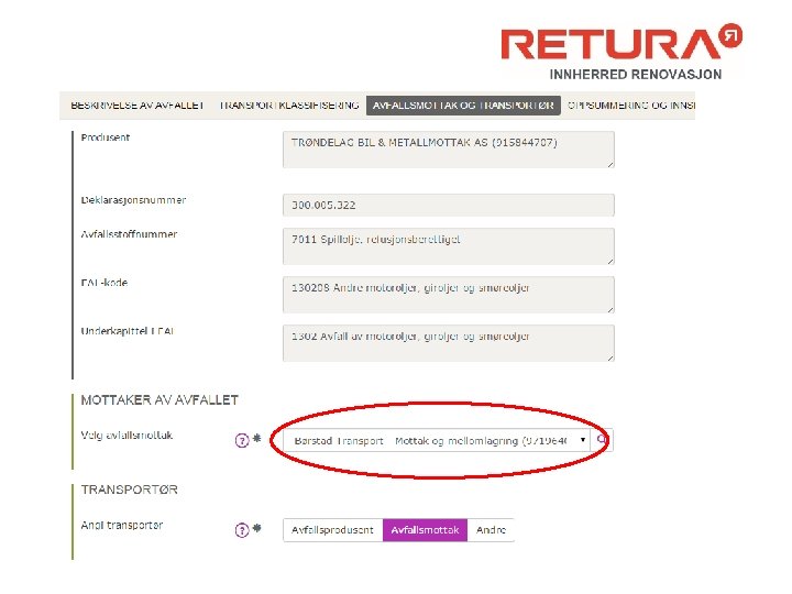 Elektronisk deklarering Oppsummering og innsending: Deklarasjonen går automatisk inn på transportør/mottakets område på Avfallsdeklarering. no. På sikt vil deklarasjon kunne importeres direkte inn i vårt ordresystem.