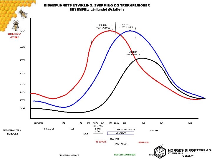 Birøkterens hovedutfordringer Hovedutfordring: Sørge for sterke kuber i trekkmodus i hovedtrekkperiodene Det krever at birøkteren: 1. Vet når hovedtrekkperioden(e) kommer 2. Vet hva en må gjøre for å få kubene på topp til hovedtrekket Da er det nyttig å ha litt kunnskap om bifolkets naturlige utviklingsforløp gjennom året!!
