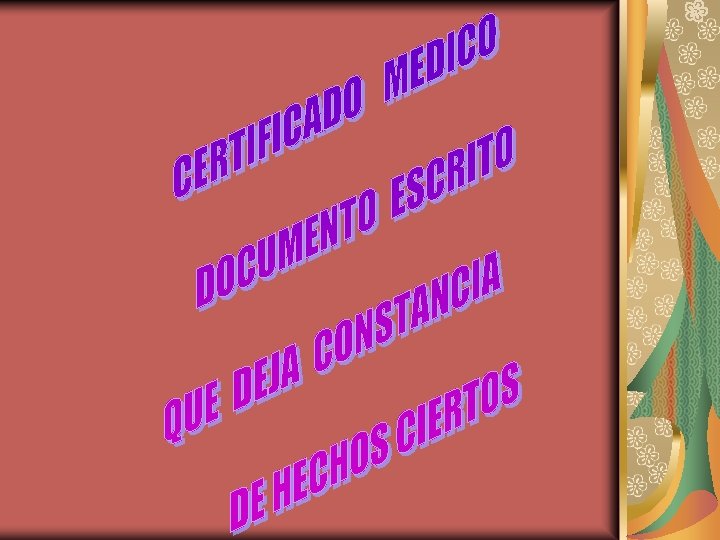 CERTIFICADO MEDICO CONSTANCIA DOCUMENTAL DE HECHOS CIERTOS. COMPROBADOS Art. 78. - es un documento destinado a acreditar el acto médico realizado Art. 79. - claro , preciso ceñido a la verdad.