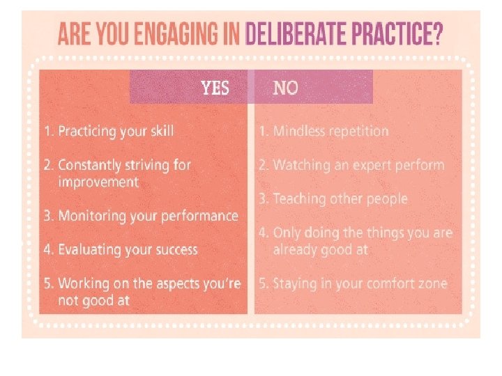 Role of the Learner Deliberate practice requires the learner to: • move out of their comfort zone • put in serious, consistent effort