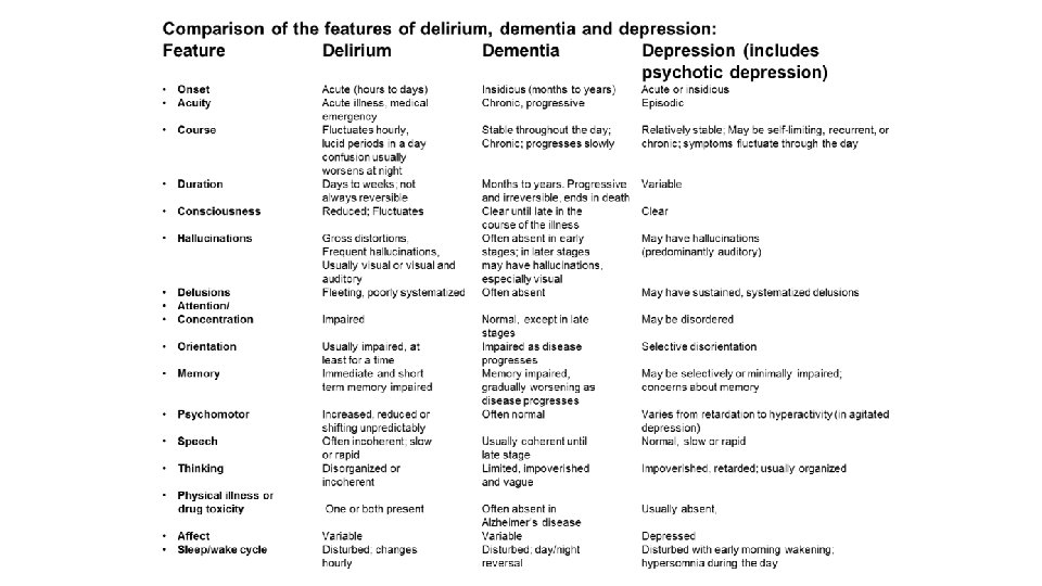 Symptoms • • • Acute onset Fluctuating course Inattention Disrupted sleep pattern Reduced awareness Reduced alertness Altered consciousness & a change in cognition Hallucinations – usually visual Fleeting delusions Labile affect Orientation – variably impaired Memory – immediate & recent impairment
