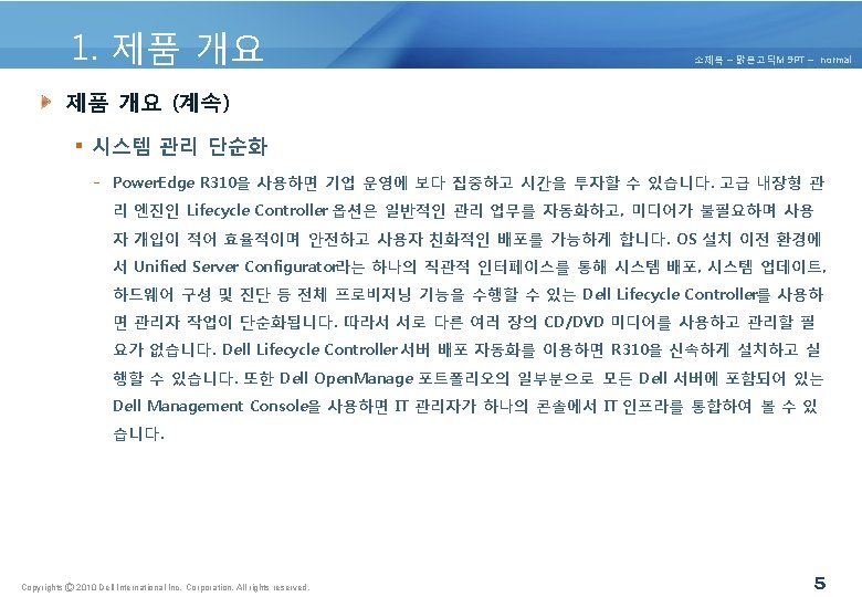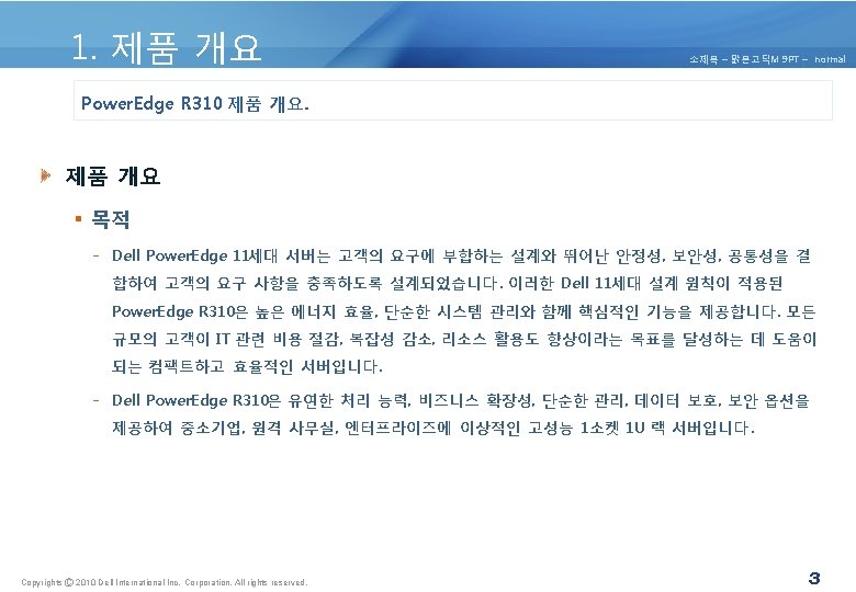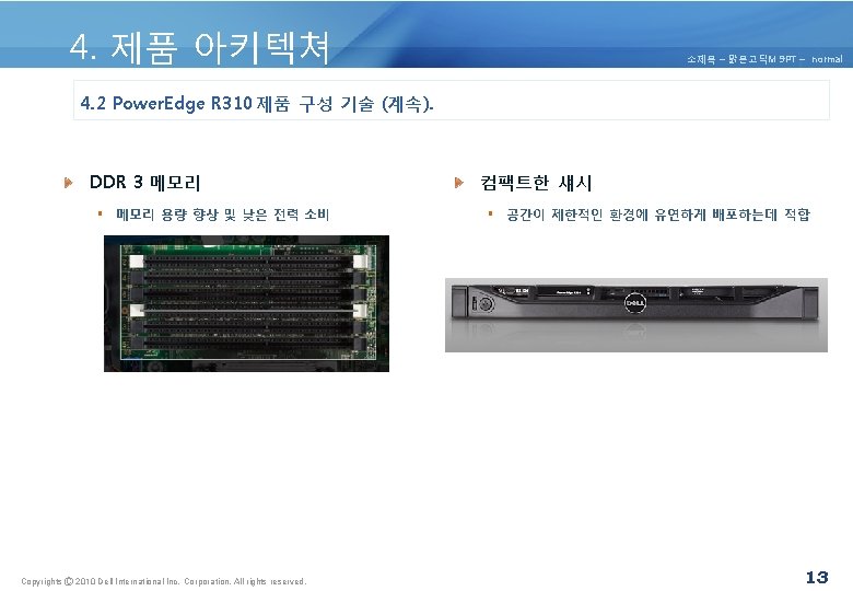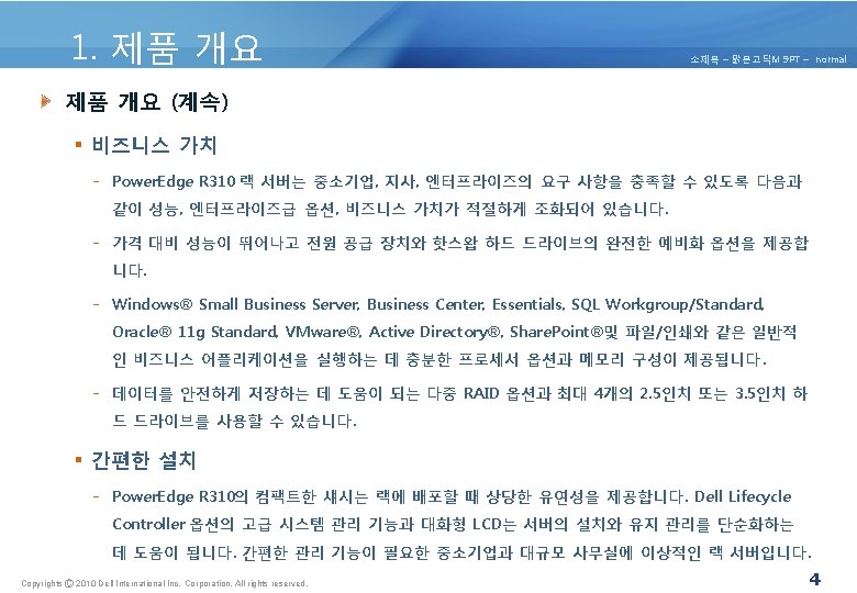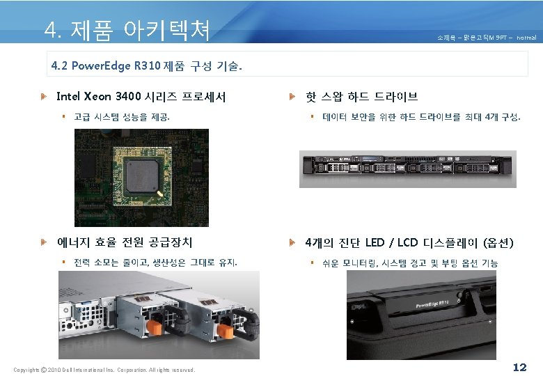 4. 제품 아키텍쳐 소제목 – 맑은고딕M 9 PT – normal 4. 1 Power. Edge R 310 제품 구성 요소 및 특징. Copyrights Ⓒ 2010 Dell International Inc. Corporation. All rights reserved. 10