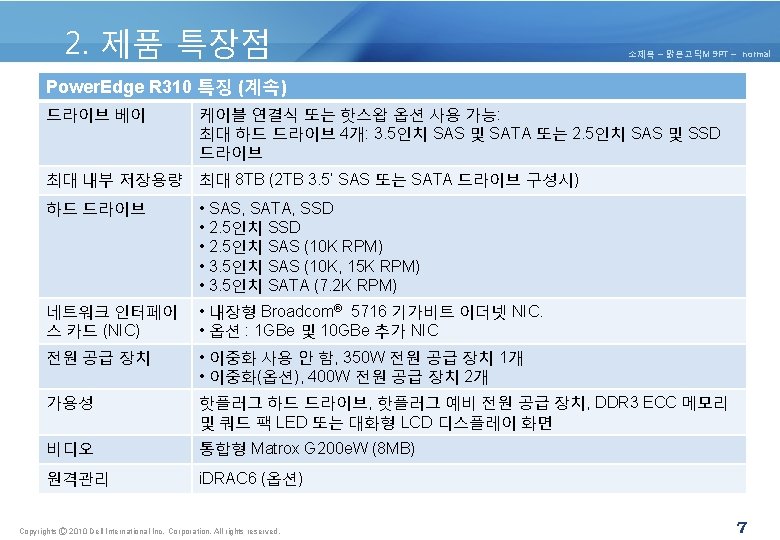 2. 제품 특장점 소제목 – 맑은고딕M 9 PT – normal Power. Edge R 310 제품 특장점. Power. Edge R 310 특징 폼 팩터 1소켓 1 U 랙 두께 프로세서 • Quad-Core Intel® Xeon® processors 3400 series • Intel® Core™ i 3 -540 • Intel® Core™ i 3 -530 • Intel® Pentium® G 6950 • Intel® Celeron® G 1101 캐쉬 2, 3, 4 MB 및 8 MB 칩셋 Intel ® 3420 Chipset 메모리 최대 32 GB (DIMM 슬롯 6개) : 1 GB/2 GB/4 GB/8 GB 1066 MHz 또는 1333 MHz I/O 슬롯 2 PCIe G 2 slots: • Slot 1: PCIe x 16 (x 8 routing), Full Height/Half Length • Slot 2: PCIe x 8 (x 8 routing), Full Height /Half Length 드라이브 컨트롤러 SAS 6/i. R, PERC H 200 또는 PERC H 700 RAID 컨트롤러 • PERC H 200 (6 Gb/s) • PERC H 700(6 Gb/s): 512 MB, 1 G 비휘발성 배터리 지원 캐시 • PERC S 100(소프트웨어 기반) Copyrights Ⓒ 2010 Dell International Inc. Corporation. All rights reserved. 6