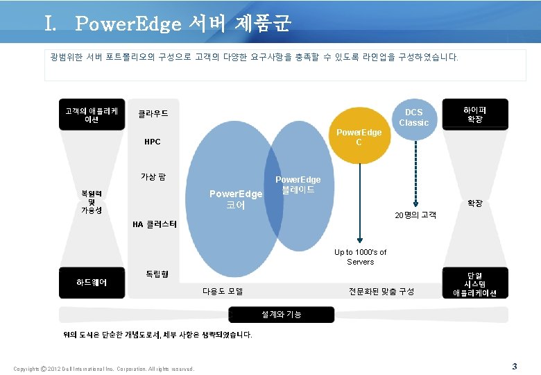 V. 서버 아키텍쳐 – 프로세서 최신 프로세서 Intel® Xeon® Processor E 5 -2600 제품군을 탑재. Intel® Xeon® Processor E 5 -2600 라인업 Model Speed TDP Cache Cores/ threads QPI Turbo E 5 -2690 E 5 -2680 E 5 -2670 E 5 -2667 E 5 -2665 E 5 -2660 E 5 -2650 L E 5 -2650 E 5 -2643 E 5 -2640 E 5 -2637 E 5 -2630 L E 5 -2620 E 5 -2609 E 5 -2603 2. 9 GHz 2. 7 Ghz 2. 6 GHz 2. 9 GHz 2. 4 GHz 2. 2 GHz 1. 8 GHz 2. 0 GHz 3. 3 GHz 2. 5 GHz 3. 0 GHz 2. 3 GHz 2. 0 GHz 2. 4 GHz 1. 8 GHz 135 W 130 W 115 W 95 W 70 W 95 W 130 W 95 W 80 W 95 W 60 W 95 W 80 W 20 M 20 M 15 M 20 M 20 M 10 M 15 M 5 M 15 M 10 M 10 M 8/16 6/12 8/16 4/8 6/12 2/4 6/12 4/8 8. 0 GT/s 8. 0 GT/s 7. 2 GT/s 6. 4 GT/s 7. 2 GT/s 6. 4 GT/s Yes Yes Yes Yes NA NA 저전력 Copyrights Ⓒ 2012 Dell International Inc. Corporation. All rights reserved. 19