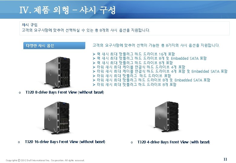 III. 서버 기술 사양 1소켓 5 U 타워 서버인 Dell Power. Edge T 320은 엔터프라이즈급 성능과 안정성를 제공합니다. 특징 기술사양 시스템 관리 IPMI 2. 0 호환 Dell Open. Manage™ Essentials 및 Dell Management Console Dell Open. Manage Power Center Dell Open. Manage Connections: • Microsoft® System Center용 Open. Manage Integration Suite • VMware® v. Center™용 Dell 플러그인 • HP Operations Manager, IBM Tivoli® Netcool® 및 CA Network and Systems Management 타워 지원 4포스트 타워용 Ready. Rails™ 슬라이딩 레일 및 케이블 관리대 옵션(나사가 있는 홀 타워의 경우 옵션 으로 제공되는 어댑터 브래킷 필요) 운영 체제 Microsoft Windows Server® 2012 (Standard, Data Center) Microsoft Windows Server® 2008 R 2 SP 1, x 64(Hyper-V™ v 2 포함) Microsoft Windows® Small Business Server 2011 SUSE® Linux® Enterprise Server Red Hat® Enterprise Linux 내장 Hypervisor 옵션: Citrix® Xen. Server™ VMware v. Sphere Copyrights Ⓒ 2012 Dell International Inc. Corporation. All rights reserved. 10