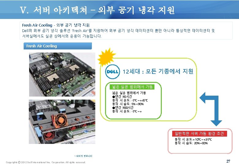 V. 서버 아키텍쳐 – 전원 공급 장치 진원 공급 장치 (PSU) Platinum 등급 효율의 750 W 및 350 W(프로세서 1개만 있을 경우) 전원 공급 장치를 지원합니다. Power Supply Unit 서버 전원 모듈 o o 350 W AC Platinum Support 100 V+ Worldwide Support 220 V+ Worldwide Auto-ranging power supplies 지시등 장착 핸들 전원 모듈 가동 상태를 지시등의 점등을 통해 표시 Rapid On 핫스페어 이중화 전원 환경에서 핫스페어 구성을 제공, 통상 운영 시는 전력 효율을 최적으로 유지하고, 장애 시는 밀리초 단위에서의 감지와 페일 오버를 실현, 고정밀도의 전력 캡핑 (Capping) 도 가능 Form factor Redundant Non-redundant Output Class 10% Efficiency targets by load 20% 50% 100% 350 W AC Platinum 82. 0% 90. 0% 94. 0% 91. 0% 495 W AC Platinum 82. 0% 90. 0% 94. 0% 91. 0% 750 W AC Platinum 91. 5% 94. 0% 96. 0% 93. 0% 350 W AC Bronze NA 85. 0% Copyrights Ⓒ 2012 Dell International Inc. Corporation. All rights reserved. 24