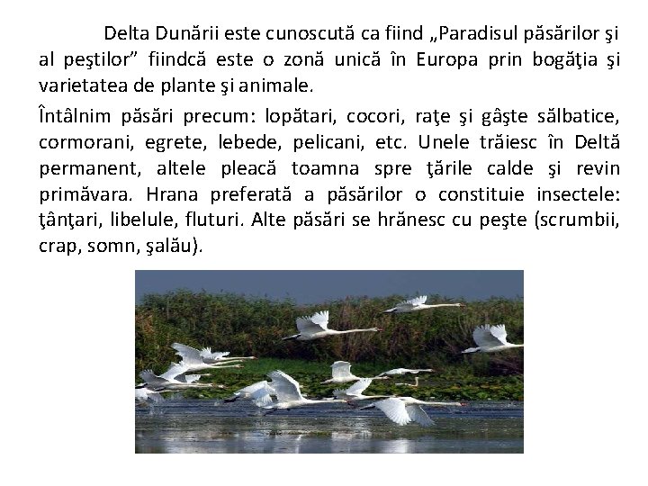 Delta Dunării este cunoscută ca fiind „Paradisul păsărilor şi al peştilor” fiindcă este o zonă unică în Europa prin bogăţia şi varietatea de plante şi animale. Întâlnim păsări precum: lopătari, cocori, raţe şi gâşte sălbatice, cormorani, egrete, lebede, pelicani, etc. Unele trăiesc în Deltă permanent, altele pleacă toamna spre ţările calde şi revin primăvara. Hrana preferată a păsărilor o constituie insectele: ţânţari, libelule, fluturi. Alte păsări se hrănesc cu peşte (scrumbii, crap, somn, şalău).