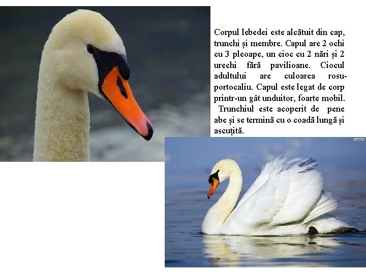 Corpul lebedei este alcătuit din cap, trunchi și membre. Capul are 2 ochi cu 3 pleoape, un cioc cu 2 nări și 2 urechi fără pavilioane. Ciocul adultului are culoarea rosuportocaliu. Capul este legat de corp printr-un gât unduitor, foarte mobil. Trunchiul este acoperit de pene abe și se termină cu o coadă lungă și ascuțită. .