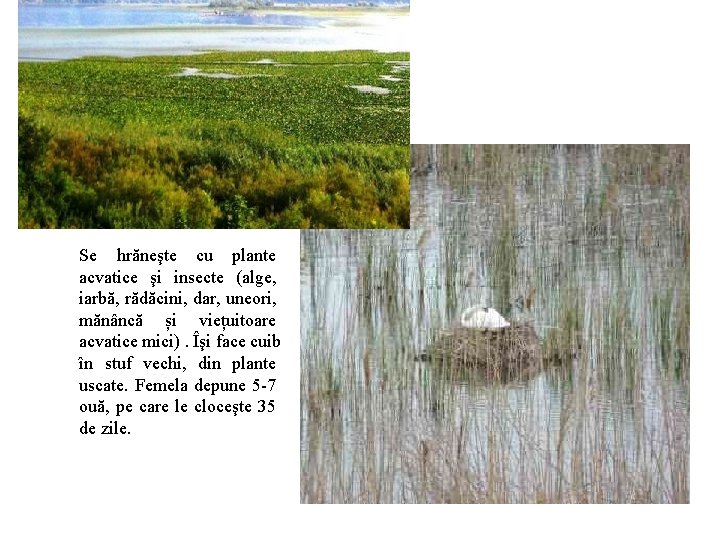 Se hrăneşte cu plante acvatice şi insecte (alge, iarbă, rădăcini, dar, uneori, mănâncă și viețuitoare acvatice mici). Îşi face cuib în stuf vechi, din plante uscate. Femela depune 5 -7 ouă, pe care le cloceşte 35 de zile.