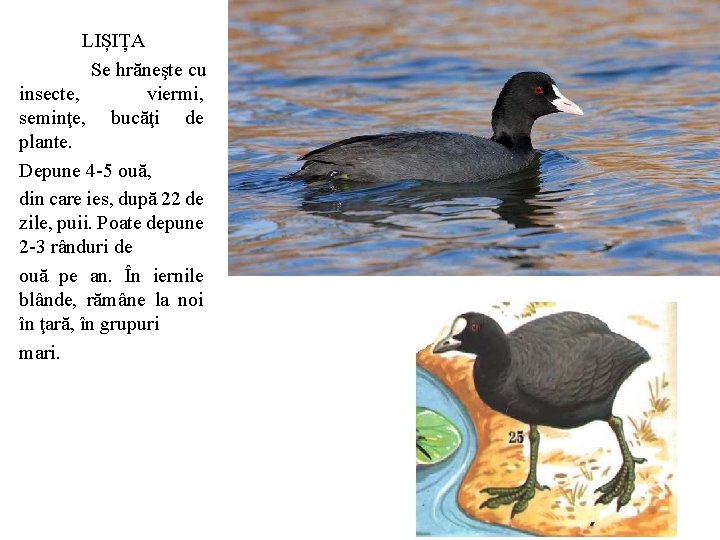 LIȘIȚA Se hrăneşte cu insecte, viermi, seminţe, bucăţi de plante. Depune 4 -5 ouă, din care ies, după 22 de zile, puii. Poate depune 2 -3 rânduri de ouă pe an. În iernile blânde, rămâne la noi în ţară, în grupuri mari.