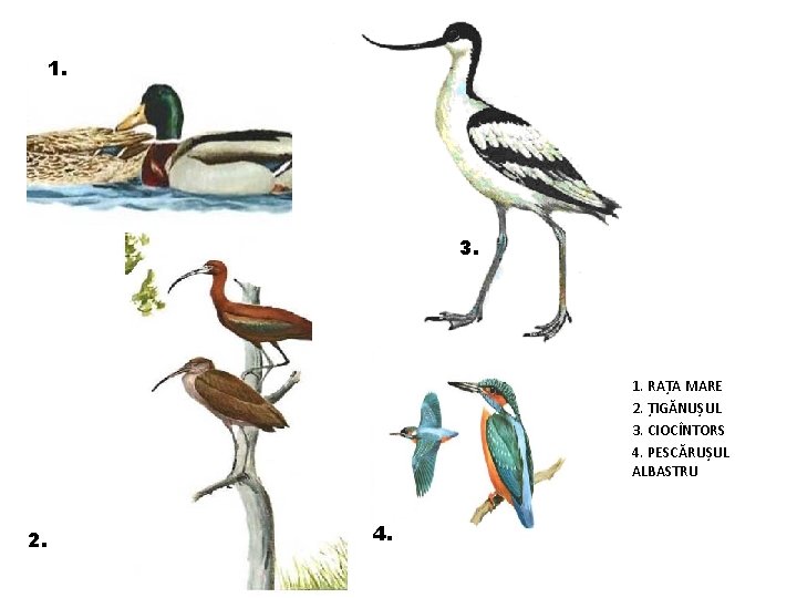 1. 3. 1. RAȚA MARE 2. ȚIGĂNUȘUL 3. CIOCÎNTORS 4. PESCĂRUȘUL ALBASTRU 2. 4.