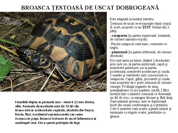 BROASCA ȚESTOASĂ DE USCAT DOBROGEANĂ Femelele depun in perioada mai – iunie 4 -12 oua sferice, albe. Perioada de incubatie este de 70 -80 zile. Hrana este in exclusivitate vegetala, alcatuita din frunze, fructe, flori. Accidental consuma melci sau rame. Ascunsa in gropi, broasca testoasa de uscat hiberneaza in anotimpul rece. Ete o specie protejata de lege. Este adaptată la mediul terestru. Țestoasa de uscat se recunoaște după corpul ei scurt, acoperit cu un ȚEST format din 2 părți: - carapacea (la partea superioară, bombată, de culoare maroniu-roșcat) Placile carapacei sunt mari, conturate cu negru. - plastronul (la partea inferioară, de culoare deschisă) Ele sunt unite pe laturi, lăsând 2 deschideri prin care ies, la partea anterioară, capul și membrele anterioare, iar la partea posterioară, membrele posterioare și coada. Coastele și vertebrele sunt concrescute cu carapacea. Capul, gâtul, picioarele și coada sunt acoperite de o piele solzoasă de culoare cenușie. Pe lângă organele de simț, asemănătoare cu ale șopârlei, există 2 fălci învelite într-o materie cornoasă ce formează un fel de cioc, cu margini tăioase și fără dinți. Sunt animale greoaie, care se deplasează încet din cauza conformației și a țesutului. Cele 4 membre sunt scurte, așezate lateral și terminate cu degete scurte, prevăzute cu gheare.