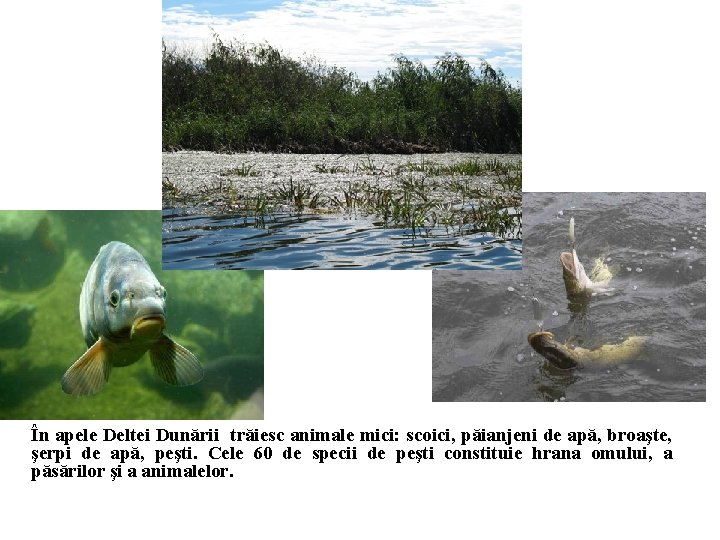 În apele Deltei Dunării trăiesc animale mici: scoici, păianjeni de apă, broaşte, şerpi de apă, peşti. Cele 60 de specii de peşti constituie hrana omului, a păsărilor şi a animalelor.
