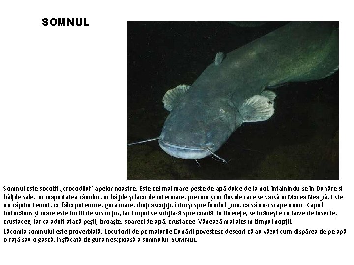 SOMNUL Somnul este socotit „crocodilul” apelor noastre. Este cel mai mare peşte de apă dulce de la noi, întâlnindu-se în Dunăre şi bălţile sale, în majoritatea râurilor, în bălţile şi lacurile interioare, precum şi în fluviile care se varsă în Marea Neagră. Este un răpitor temut, cu fălci puternice, gura mare, dinţi ascuţiţi, întorşi spre fundul gurii, ca să nu-i scape nimic. Capul butucănos şi mare este turtit de sus în jos, iar trupul se subţiază spre coadă. În tinereţe, se hrăneşte cu larve de insecte, crustacee, iar ca adult atacă peşti, broaşte, şoareci de apă, crustacee. Vânează mai ales în timpul nopţii. Lăcomia somnului este proverbială. Locuitorii de pe malurile Dunării povestesc deseori că au văzut cum dispărea de pe apă o raţă sau o gâscă, înşfăcată de gura nesăţioasă a somnului. SOMNUL