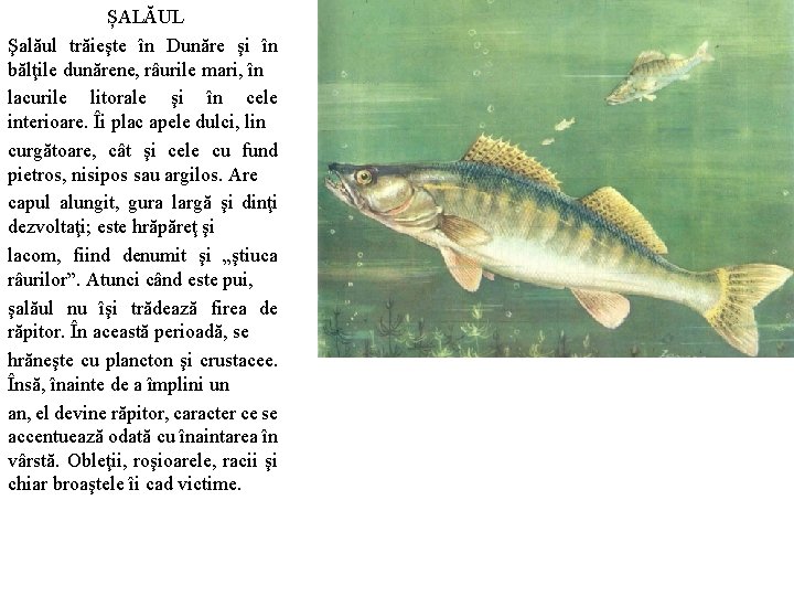 ȘALĂUL Şalăul trăieşte în Dunăre şi în bălţile dunărene, râurile mari, în lacurile litorale şi în cele interioare. Îi plac apele dulci, lin curgătoare, cât şi cele cu fund pietros, nisipos sau argilos. Are capul alungit, gura largă şi dinţi dezvoltaţi; este hrăpăreţ şi lacom, fiind denumit şi „ştiuca râurilor”. Atunci când este pui, şalăul nu îşi trădează firea de răpitor. În această perioadă, se hrăneşte cu plancton şi crustacee. Însă, înainte de a împlini un an, el devine răpitor, caracter ce se accentuează odată cu înaintarea în vârstă. Obleţii, roşioarele, racii şi chiar broaştele îi cad victime.