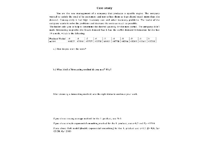 Possible questions in the exam • Name subjective forecasting methods • In which life cycle period are subjective/objective methods used? • Name the similarities/differences between moving average and exponential smoothing. • Name differences between forecasts made by simple exponential smoothing(moving average) with a small and a large α (N) value? • Name three different forecasting errors