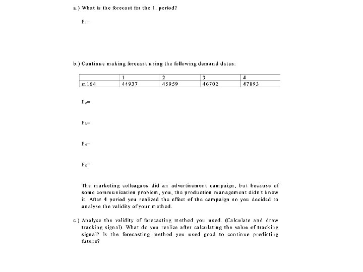 Example • Draw the tracking signal diagram • Evaluate the validity of forecasting method applied – – Only few data were available Does not step out of control borders Decreasing trend, systematic undervaluation There is a negative trend instead of constant demand, there is a constant demand instead of positive trend, etc.