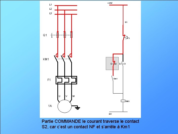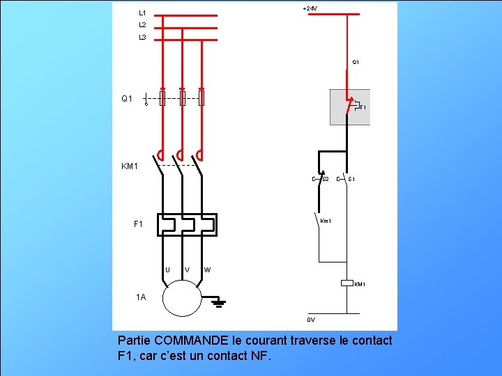 +24 V L 1 L 2 L 3 Q 1 F 1 KM 1 S 2 S 1 Km 1 F 1 U V W KM 1 1 A 0 V Partie COMMANDE le courant traverse le contact F 1, car c’est un contact NF.