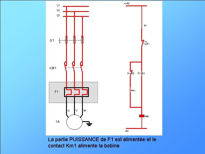 +24 V L 1 L 2 L 3 Q 1 F 1 KM 1 S 2 S 1 Km 1 F 1 U V W KM 1 1 A 0 V La bobine du contacteur KM 1 est alimentée
