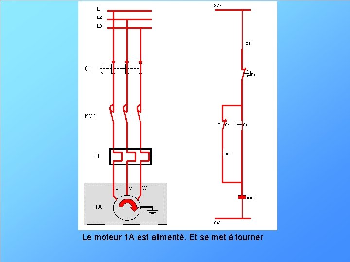 +24 V L 1 L 2 L 3 Q 1 F 1 KM 1 S 2 S 1 Km 1 F 1 U V W KM 1 1 A 0 V Le moteur 1 A est alimenté. Et se met à tourner