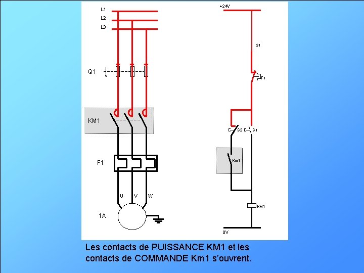 +24 V L 1 L 2 L 3 Q 1 F 1 KM 1 S 2 S 1 Km 1 F 1 U V W KM 1 1 A 0 V Les contacts de PUISSANCE KM 1 et les contacts de COMMANDE Km 1 s’ouvrent.