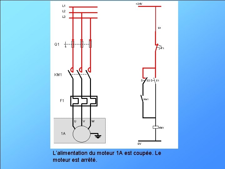 +24 V L 1 L 2 L 3 Q 1 F 1 KM 1 S 2 S 1 Km 1 F 1 U V W KM 1 1 A 0 V L’alimentation du moteur 1 A est coupée. Le moteur est arrêté.