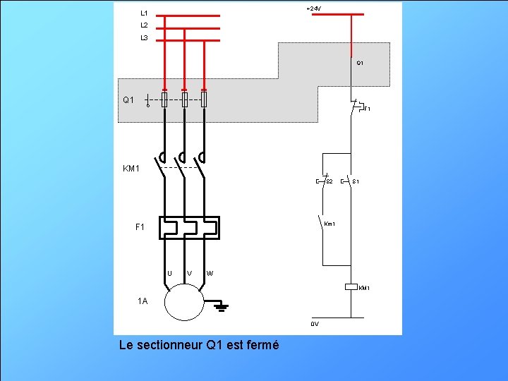 +24 V L 1 L 2 L 3 Q 1 F 1 KM 1 S 2 S 1 Km 1 F 1 U V W KM 1 1 A 0 V Le sectionneur Q 1 est fermé