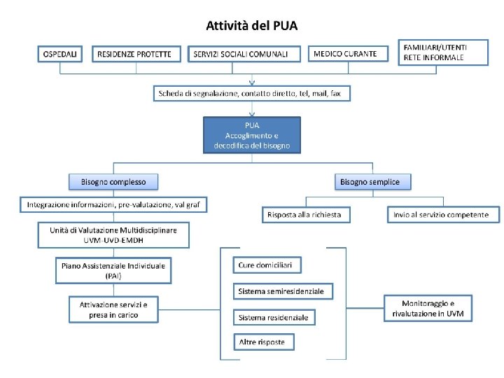 UVD UNITA’ DI VALUTAZIONE DISTRETTUALE Commissione multi-disciplinare distrettuale • effettua una valutazione multi-dimensionale • elabora un piano assistenziale individuale (PAI) con la partecipazione dei familiari