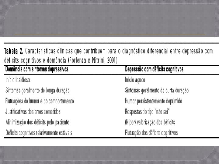 Sintomas Similares � Lentificação psíquica � Apatia � Irritabilidade � Descuido pessoal � Dificuldade no comportamento � Memória � Mudanças no comportamento e personalidade “Além disto, a depressão pode ser um sintoma da demência e, não raramente, ambas as situações coexistem (Raskind, 1998)”