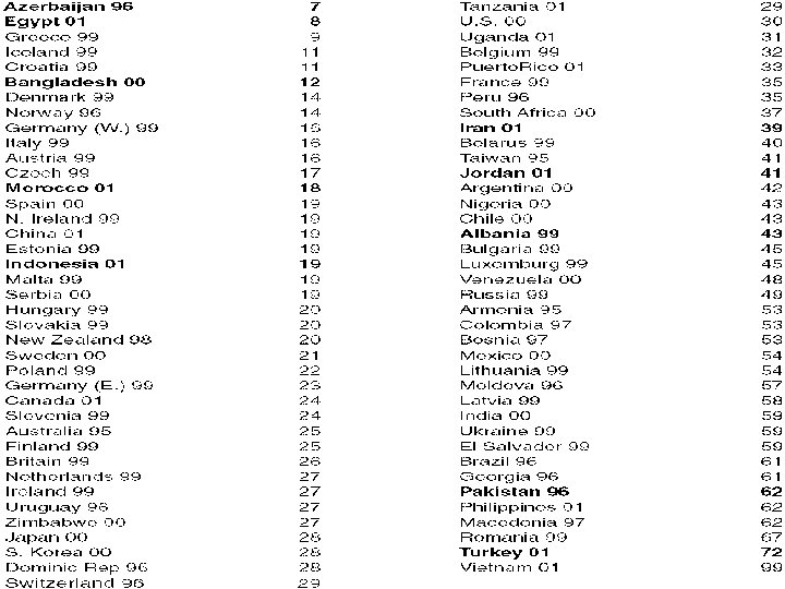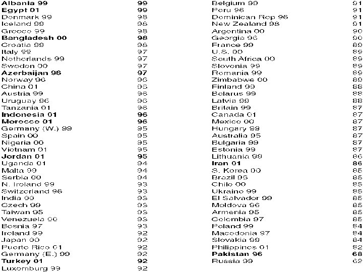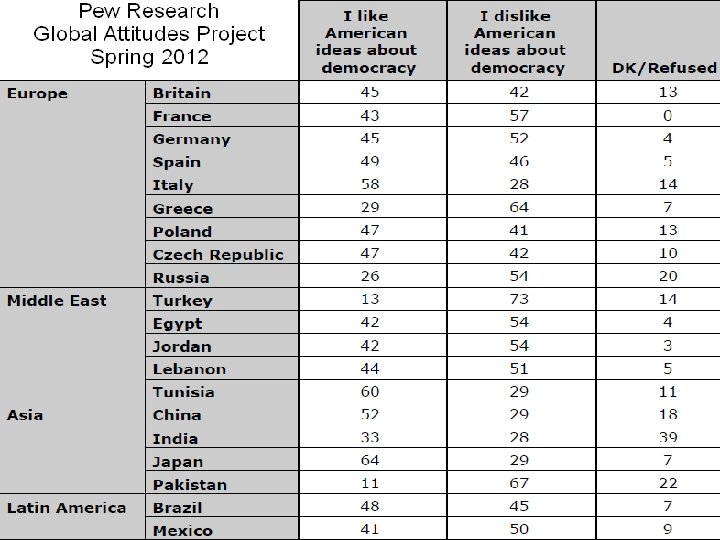 Support for Democracy • World Values Surveys and European Values Surveys • The following slide shows the percentage of respondents who said a democratic system is a ``very good” or ``fairly good” way of governing this country • Most Islamic and Pacific Asian countries actually rank relatively high