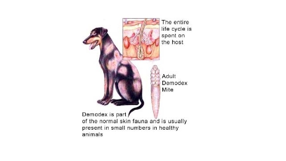 • Demodicosis is caused by a microscopic, cigar-shaped skin parasite called Demodex. • This mite is normally found in low numbers in the hair follicles of all animals, including humans. • In dogs, the mites (Demodex canis) are passed from the dam to the puppy during the first few days of life. • Demodex becomes a problem when the mites multiply and proliferate inside the hair follicles. • Their massive numbers cause an inflammatory reaction and a secondary bacterial infection. • As a result, the hair follicles are destroyed.