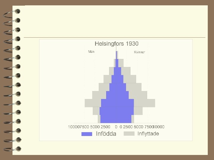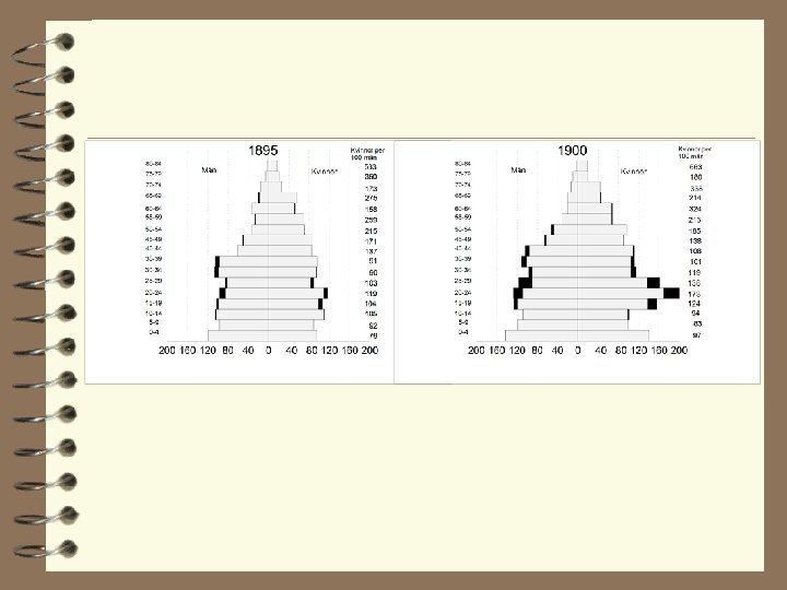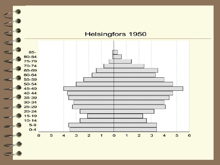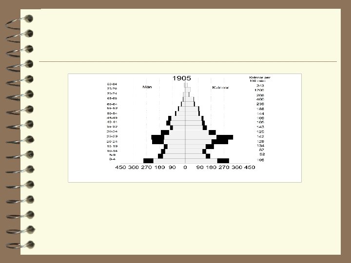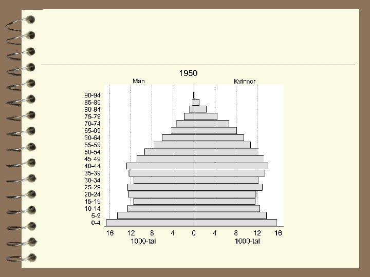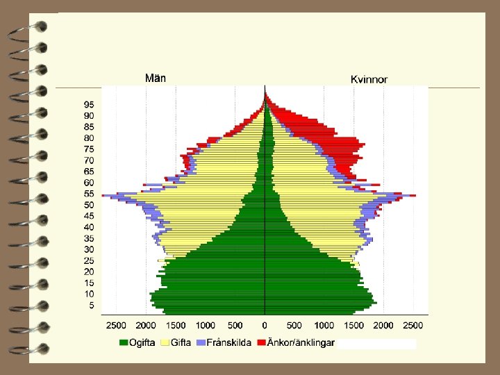 Ett par demografiska begrepp Kohort – grupp av individer med gemensam egenskap som följs framåt i tiden. Ex födelsekohort, äktenskapskohort Befolkningspyramid – histogram , vanligen vågrätt, som illustrerar en befolknings åldersstruktur. Kan även inkludera t. ex. civilstånd.