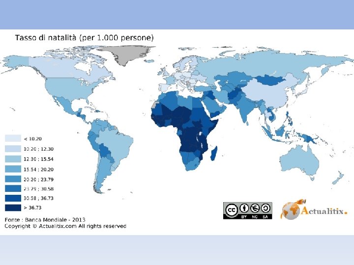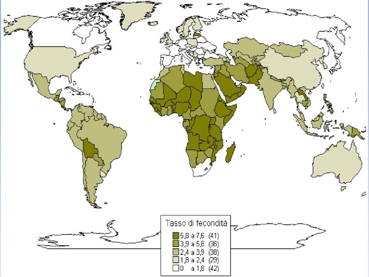 Gli indicatori demografici dati che permettono di conoscere alcuni fenomeni relativi alla popolazione di una certa zona geografica Tasso di natalità = numero delle nascite annuali per ogni mille abitanti Tasso di mortalità = numero delle morti annuali per ogni mille abitanti Saldo naturale = differenza tra il numero dei nati vivi e quello dei morti Saldo migratorio = differenza tra emigrati ed immigrati Speranza di vita = durata media della vita Tasso di fecondità = media dei figli per ogni donna in età fertile