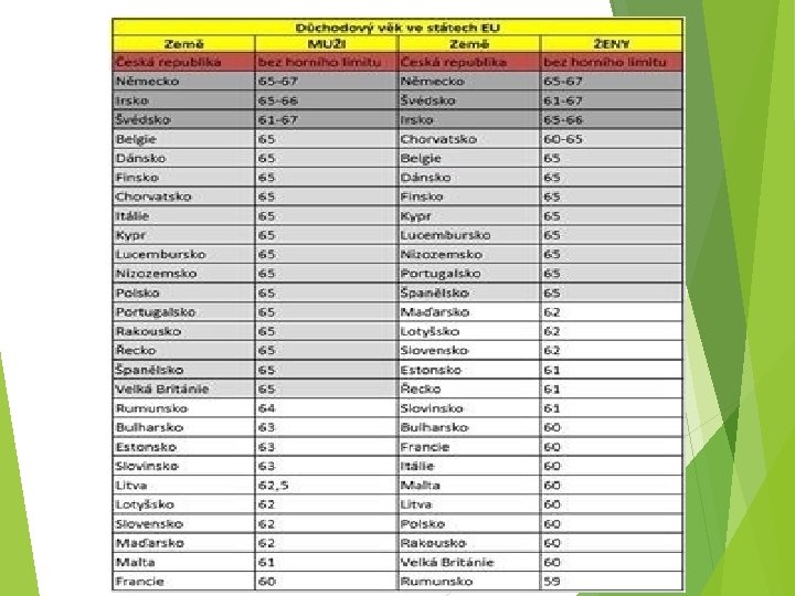Demografická statika Vek odchodu do dôchodku vo vybraných krajinách Európy muži ženy Belgicko 65 Francúzsko 60 Taliansko 65 60 Island 67 Nórsko 67 Rakúsko 65 60 Poľsko 65 60 ČR 62 61 Mad’arsko 62 Slovensko 62 Veľká Británia 65 Nemecko 65 Španielsko 65 Francúzsko 60 60 Írsko 66 66 62 a viac 65 (zdroj: http: //www. employment. gov. sk/pk/2298_2001_III_11/priloha_d. xls)