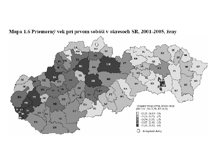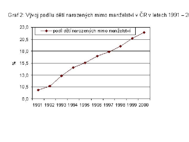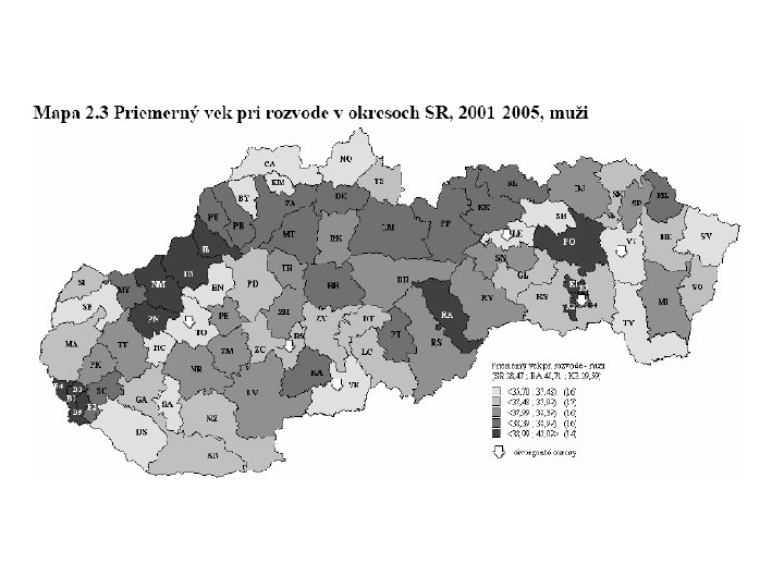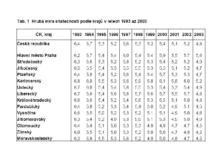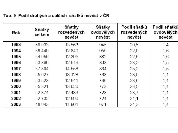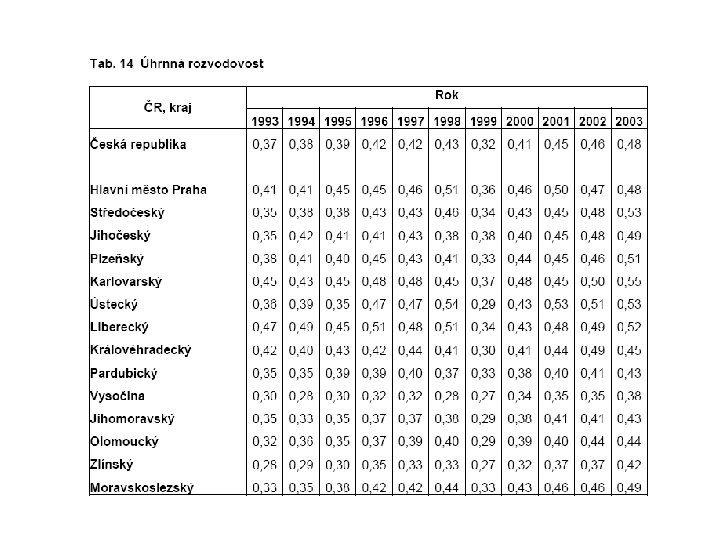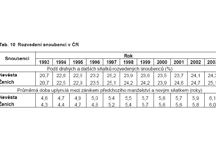 ukazatele • Míra rozvodovosti manželství (mrm) - počet rozvodů dělíme počtem existujících manželství (v praxi počtem vdaných žen). • Míra rozvodovosti manželství podle věku - počet rozvodů ve věku x vztažený ke střednímu stavu osob žijících v manželství v příslušném věku (vdaných žen, resp. ženatých mužů).