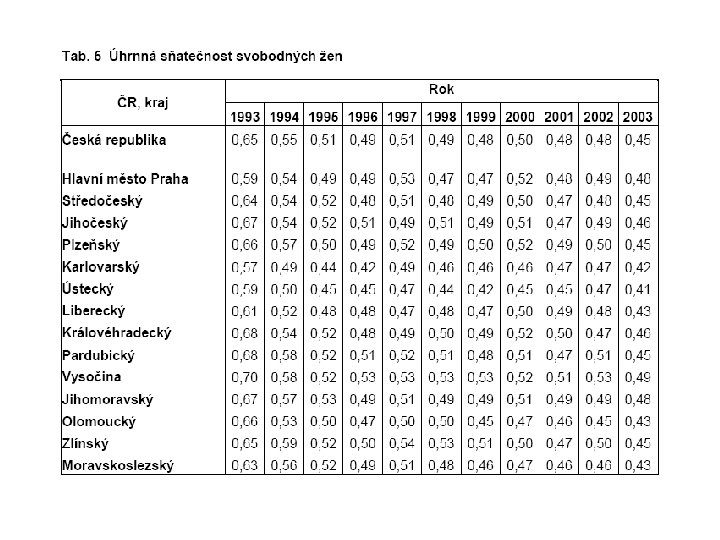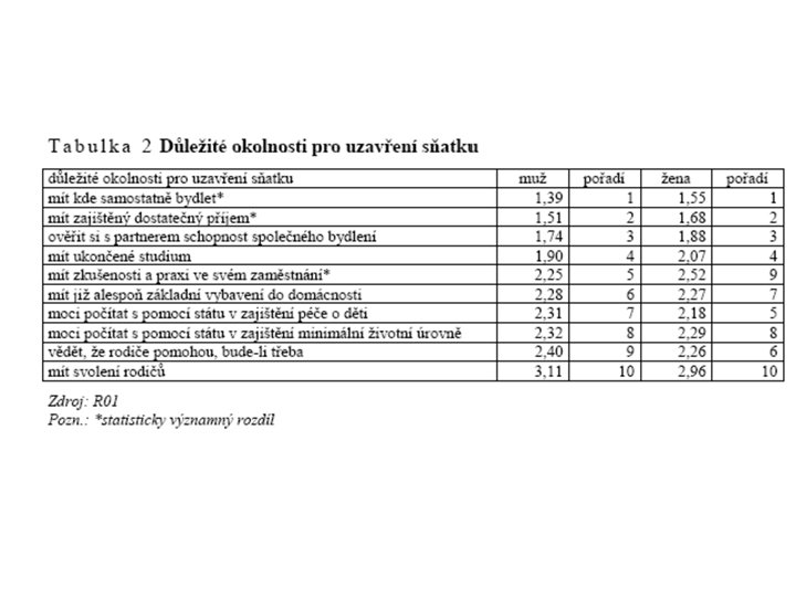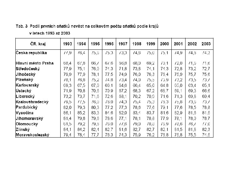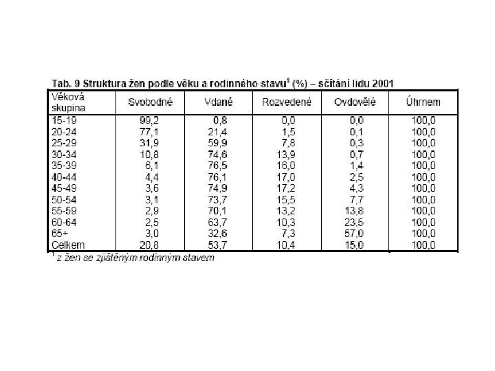 Tabulky sňatečnosti • Proces uzavírání manželství nejlépe charakterizují sňatkové tabulky. Vstupní charakteristikou těchto tabulek je pravděpodobnost uzavření sňatku a výslednou charakteristikou je podíl svobodných ve věku do 50 let. Princip konstrukce sňatkových tabulek je obdobný jako u úmrtnostních tabulek. Rozlišují se dva druhy sňatkových tabulek: • sňatkové tabulky jednovýchodné - zanedbávají vliv úmrtí a migrace svobodných na sňatečnost • sňatkové tabulky několikavýchodné (nejčastěji dvouvýchodné) - již s rušivými vlivy počítají.