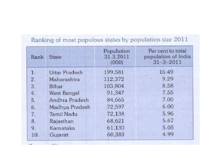 Population Density • Ratio between total population and surface area • In India it is number of persons living per square kilometre • 1901: 77/sq km • 2001: 325/sq km • 2011: 382/sq km