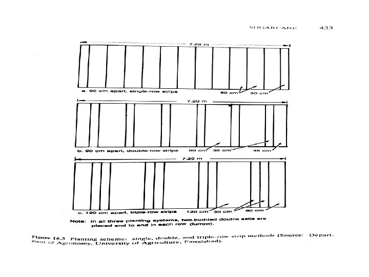 PLANTING METHODS OF SUGARCANE There are two planting methods of sugarcane 1. Strip planning 2. Pit planting 1. Strip planting It is further divided into three methods Single row strip = 60 cm apart Double row strip = 90 cm apart Triple row strip = 120 cm apart