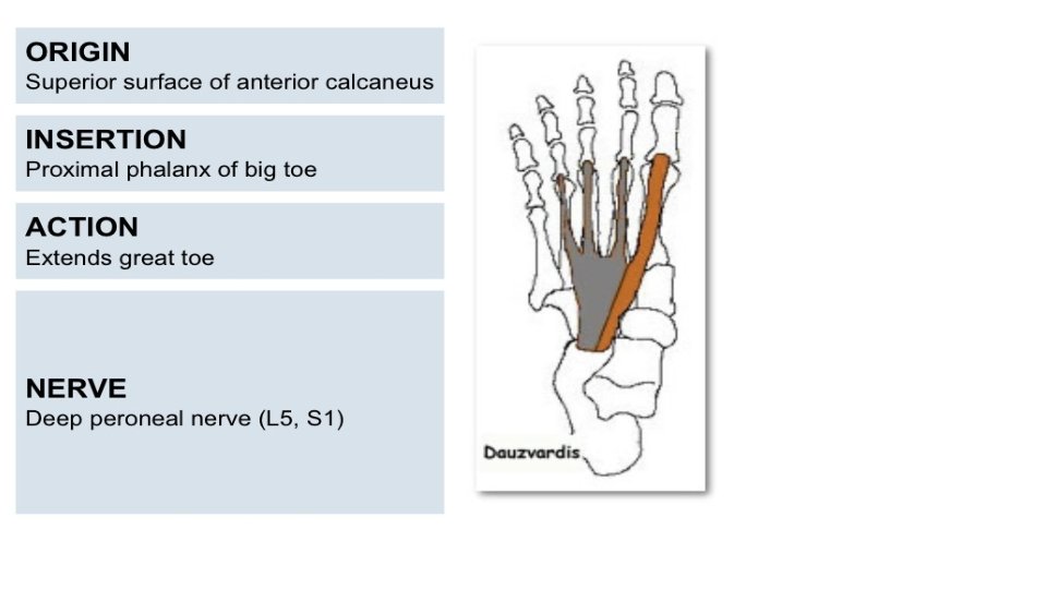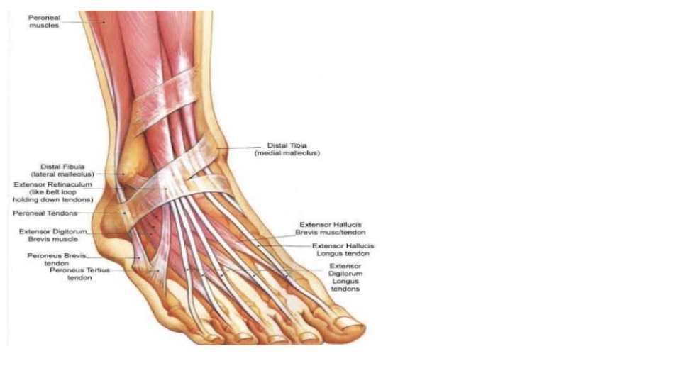 Extensor digitorum longus Inferior Extensor retinaculum Extensor Hallucis Longus Tibialis Anterior Superior Extensor Retinaculum